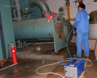 4、洗凈表冷器里層間隙內(nèi)的灰塵后,用高壓霧化水噴吹,操作時(shí)應(yīng)防止盤管鋁翅片折彎、變形,一邊噴吹一邊用吸塵器收集灰塵及污水;